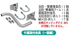 支柱・壁兼用金具、支柱・壁兼用アーム、裏板取付金具、支柱取付Uボルト2組、M8×20 根角ボルト7本