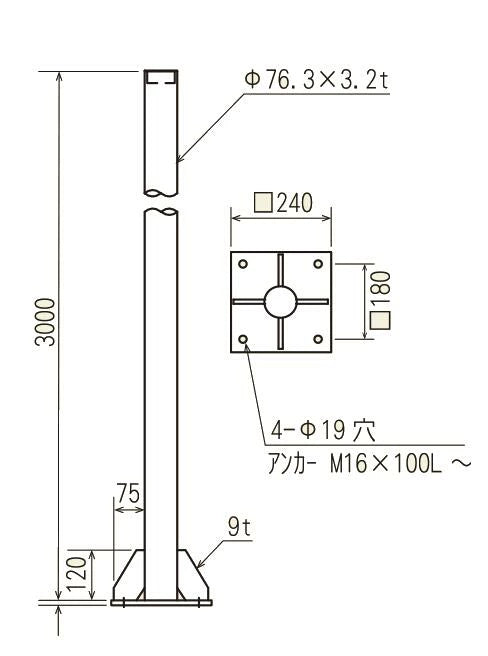 直径 89.1mm 長さ L=3300mm 肉厚 3.2t /ベースサイズ 300mm角
