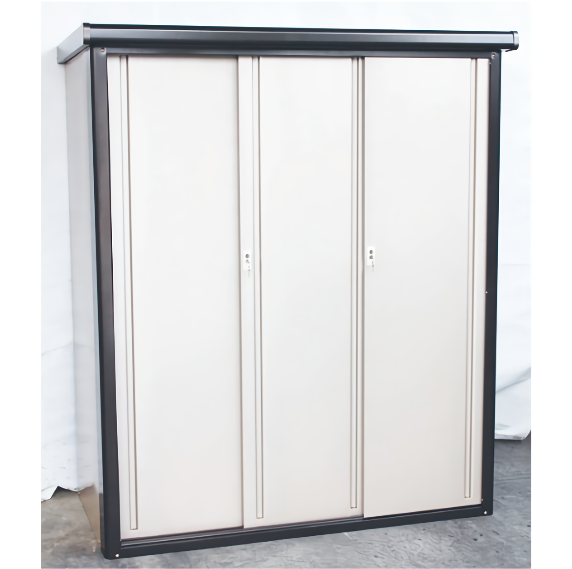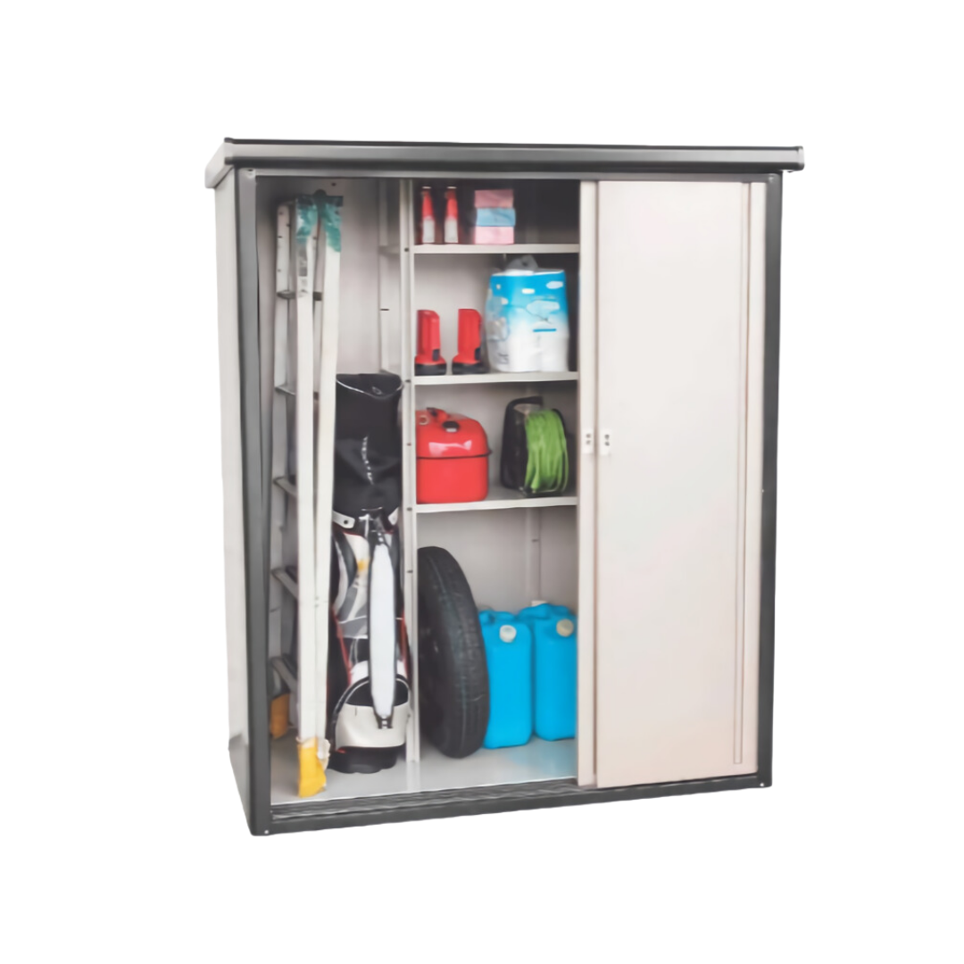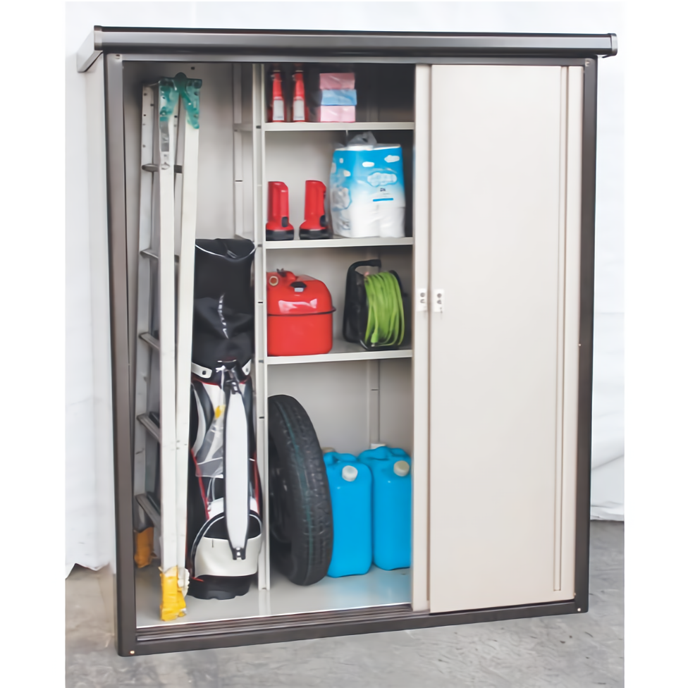 ・コンパクトながらもスチール製で頑丈な構造が特徴で、家庭用物置やガレージ、軒下の収納として最適です。